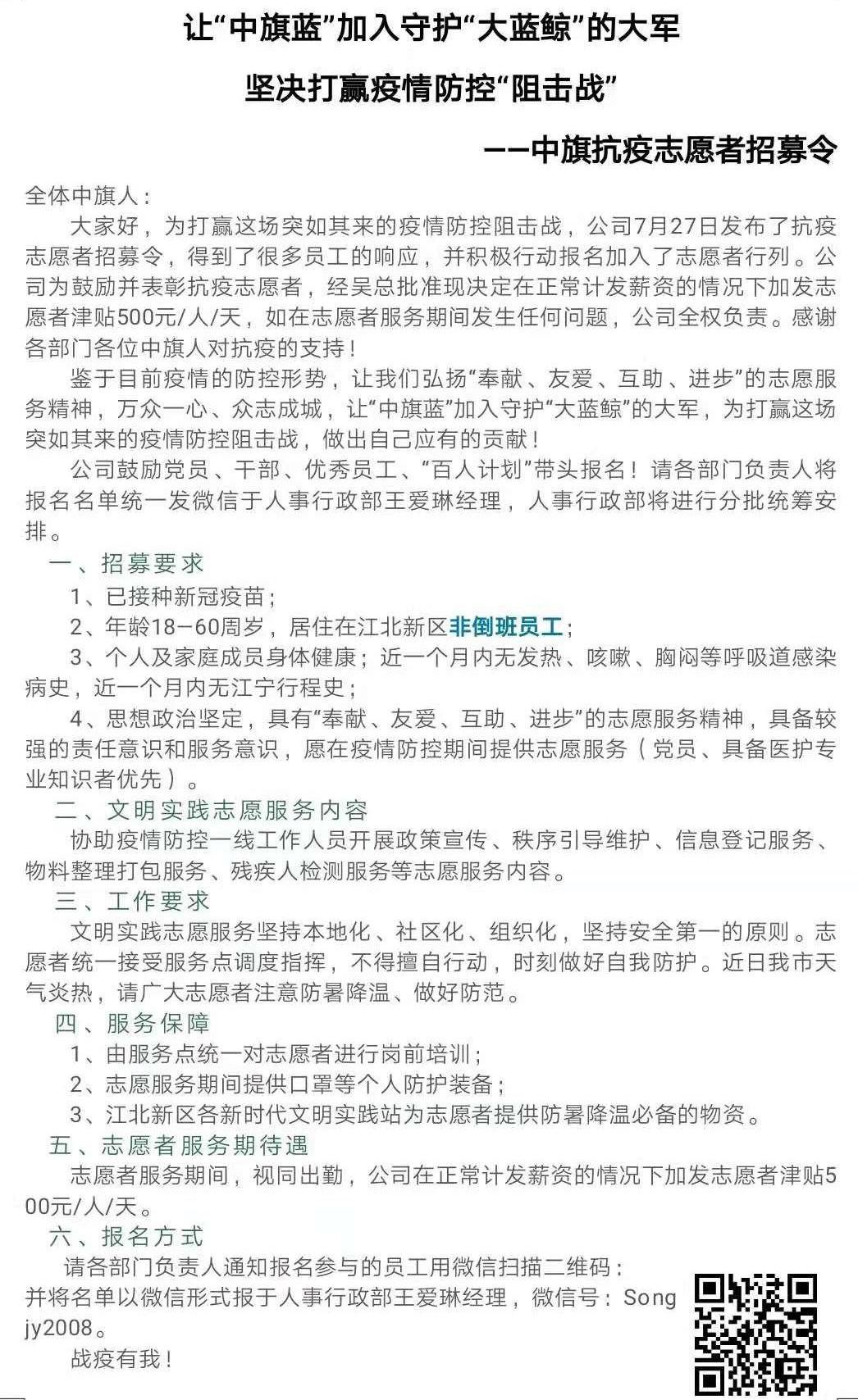 自7月20日南京祿口爆發(fā)新一輪新冠疫情以來,中旗科技立即行動組織全員應(yīng)對這場防疫攻堅戰(zhàn)。根據(jù)政府防疫布控要求,嚴(yán)格落實各項防疫防控措施。確保每位員工做好個人防護、定時定點核酸檢測。公司還于7月27日、29日兩度發(fā)布中旗科技“抗疫志愿者招募令”,倡議符合條件的員工,尤其是黨員、干部、優(yōu)秀員工、“百人計劃”積極報名,志愿加入江北新區(qū)疫情防控一線工作中,協(xié)助開展政策宣傳、秩序引導(dǎo)、檢測協(xié)助等社會防疫活動。通知一經(jīng)發(fā)布,得到了中旗員工廣泛響應(yīng)和積極報名。